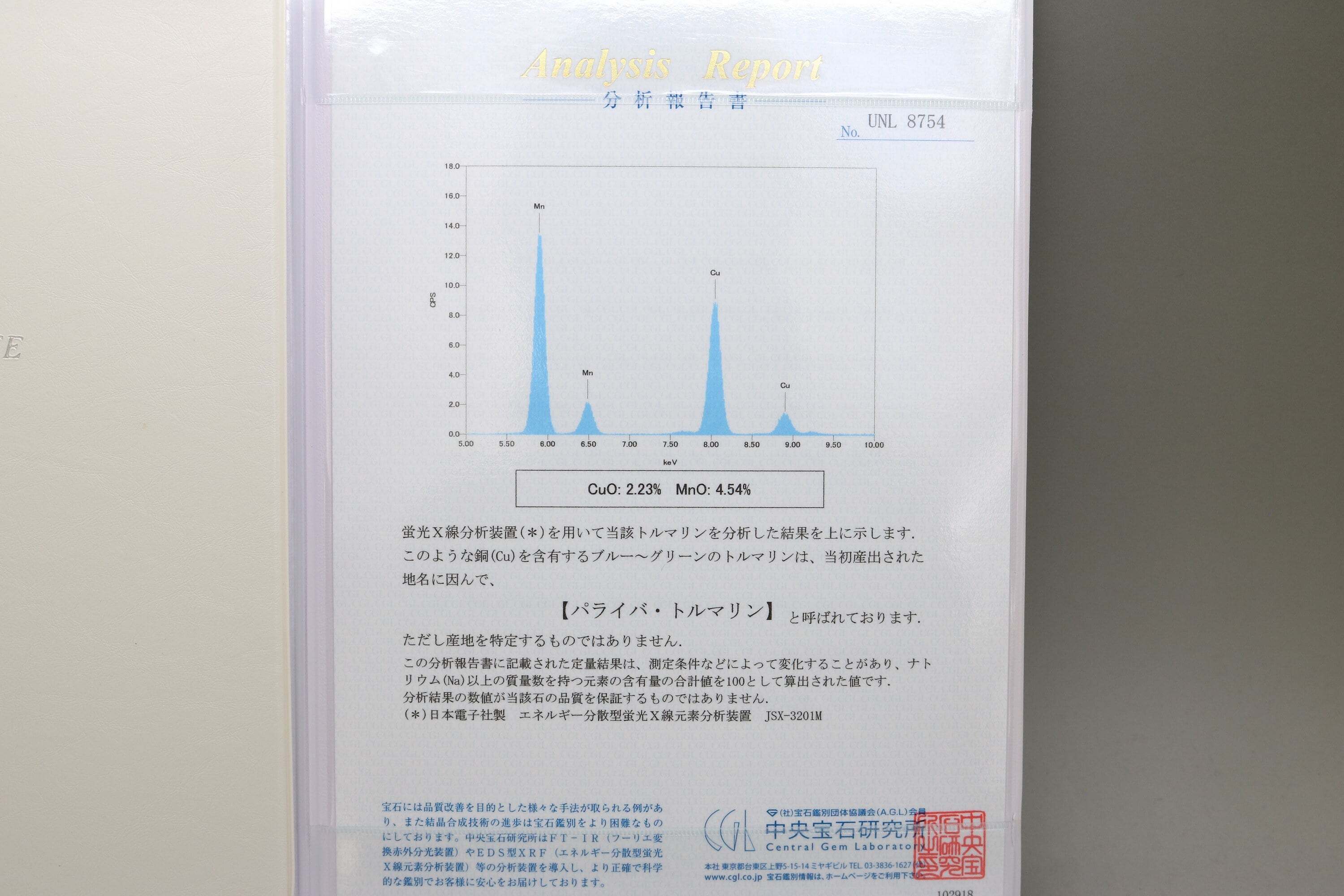中央宝石研究所の鑑別書付き(パライバトルマリンの分析報告書)