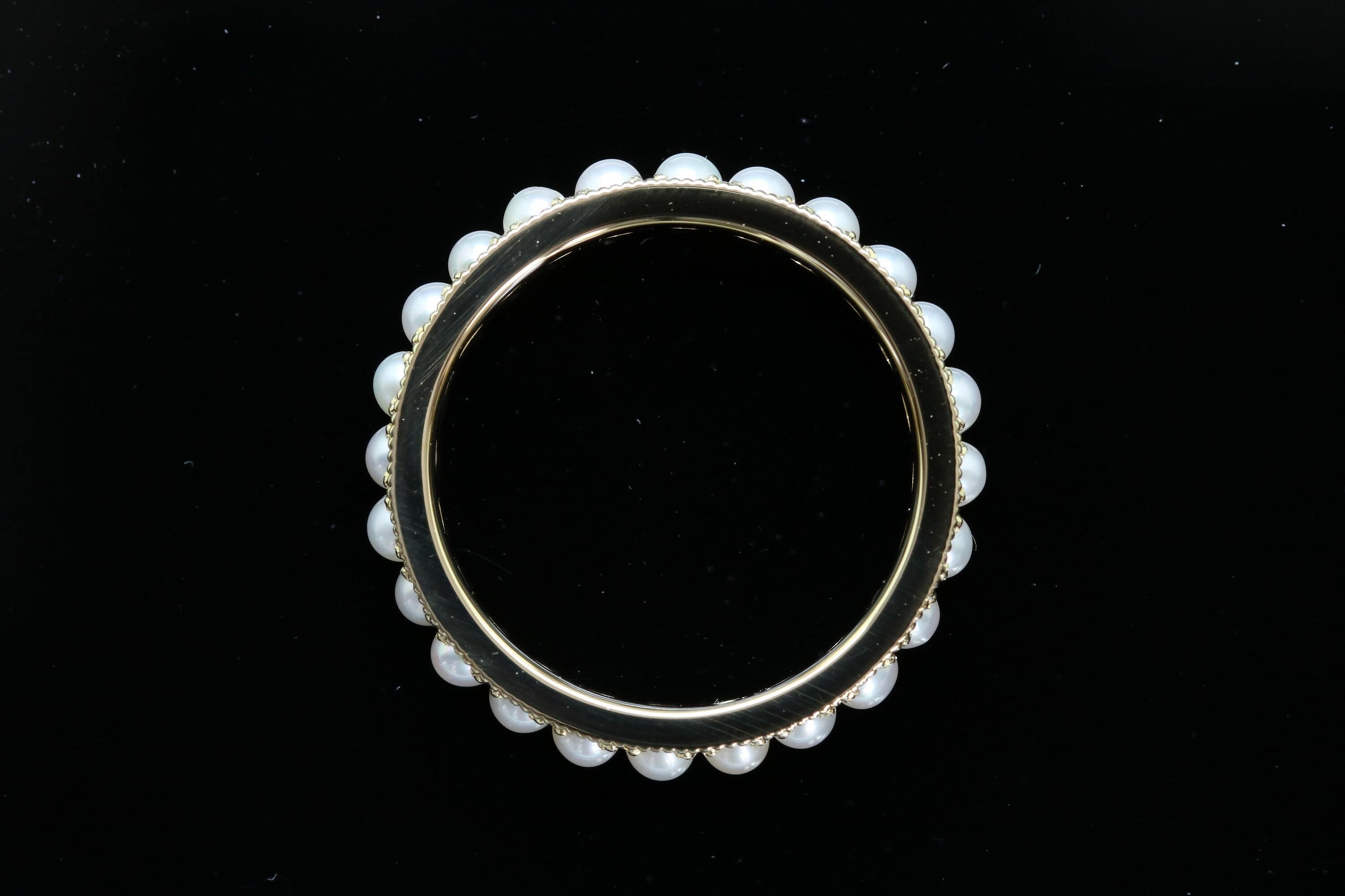 無穴の淡水真珠を指輪全体に“彫り留め”で留め、指輪の縁には“ミル”を施しました。